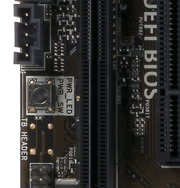 Теперь, когда мы разобрались с разделением слотов и портов, обратимся к другим особенностям платы Asus Z97-A. Прежде всего, стоит отметить наличие на плате кнопки включения питания. Правда, кнопок перезагрузки и ClearCMOS на ней не предусмотрено. Отсутствует и индикатор POST-кодов.