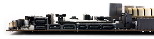 Для подключения накопителей или оптических приводов на плате предусмотрено в совокупности шесть портов SATA 6 Гбит/с, которые поддерживают возможность создания RAID-массивов уровней 0, 1, 5, 10 и реализованы на базе интегрированного в чипсет SATA-контроллера. Два из этих шести портов SATA 6 Гбит/с входят в состав разъема SATA Express, но, тем не менее, могут использоваться и отдельно. Последнее обстоятельство немаловажно, поскольку пока еще на рынке практически нет накопителей с интерфейсом SATA Express, а те, что есть, стоят очень дорого. Поэтому, важно, что несмотря на наличие разъема SATA Express на плате, количество доступных портов SATA 6 Гбит/с не уменьшилось.