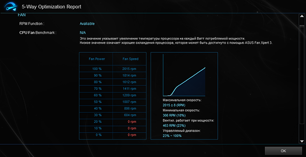 Ну а обновленная утилита Fan Xpert 3 (ранее была утилита Fan Xpert 2) предназначена для настройки скоростного режима подключенных вентиляторов. При настройке скорости вращения вентиляторов имеется возможность корректировать график зависимости скорости вращения от показаний связанного с вентилятором температурного датчика. Причем имеется возможность в автоматическом режиме определять зависимость скорости вращения вентилятора от скважности управляющих PWM-импульсов (для четырехконтактных вентиляторов).