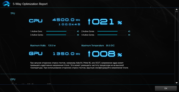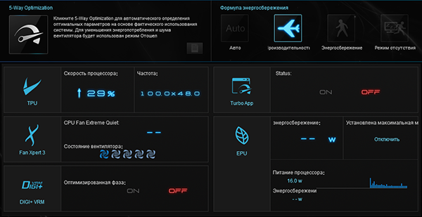 Отдельные утилиты TPU, EPU, Digi+ VRM, Fan Xpert 3 и TurboApp предназначены для ручной настройки системы, а утилита 5-Way Optimization позволяет одним кликом мыши полностью оптимизировать систему (разогнать процессор и графическое ядро, оптимизируя при этом энергопотребление, а также реализуя настройку скоростного режима подключенных вентиляторов и настройку регулятора напряжения питания процессора. Также утилита 5-Way Optimization позволяет задавать режим энергопотребления ПК («максимальная производительность», «сбалансированный», «максимальная экономия энергии», режим «отошел»). К примеру, для процессора Intel Core i7-4770K с использованием утилиты 5-Way Optimization был реализован разгон до частоты 4,5 ГГц.