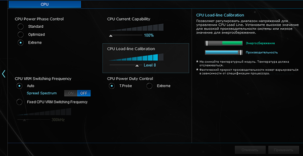 Утилита Digi+ VRM предназначена для настройки регулятора напряжения питания и позволяет задать нагрузочную кривую (Load-line Calibration), часто́ты работы преобразователей для процессора и памяти и некоторые другие параметры.