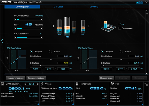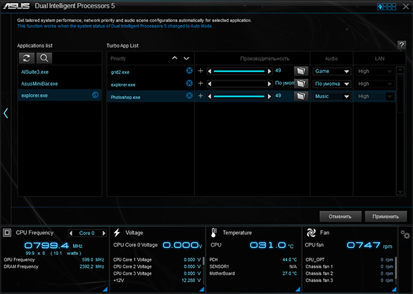 Большинство из этих утилит хорошо нам известны: они давно входят в комплект поставки плат Asus, так что мы не будем заострять на них внимание. А вот Dual Intelligent Processors 5 — это действительно новая утилита, которая пришла на смену утилите Dual Intelligent Processors 4.