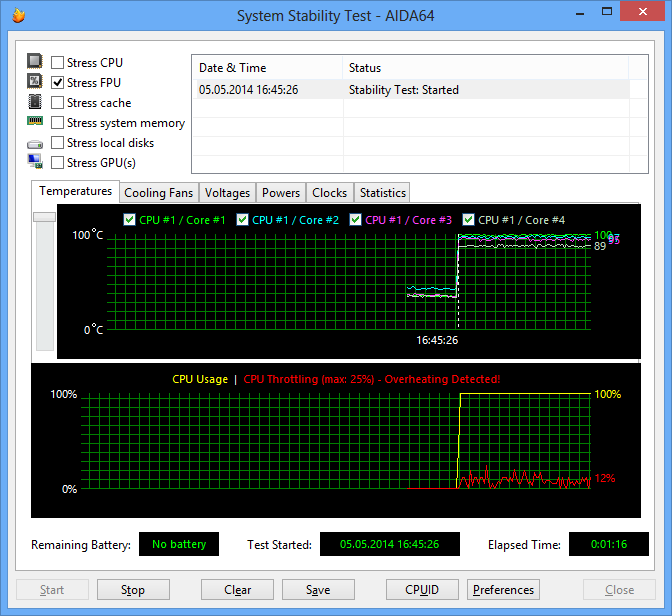 При более интенсивной нагрузке с использованием теста Stress FPU температура ядер процессора достигала уже критического значения и активировался режим троттлинга, а тактовая частота опускалась до значения в 3,8 ГГц (при тестировании использовался кулер Thermaltake Contac 30).