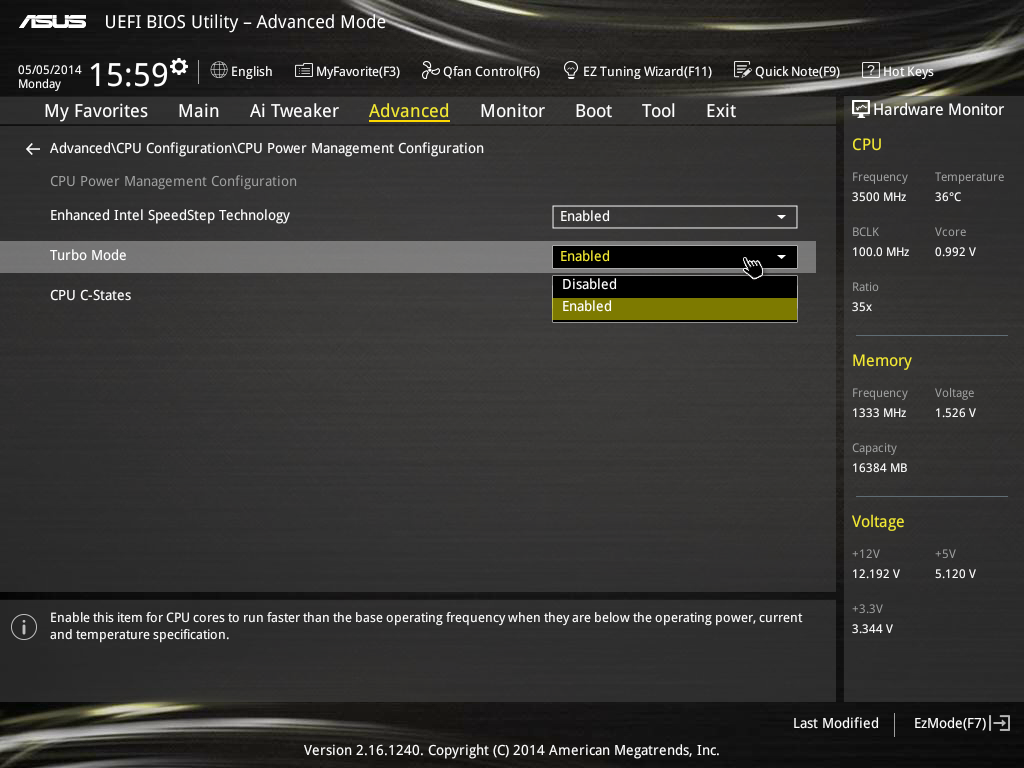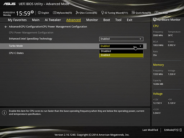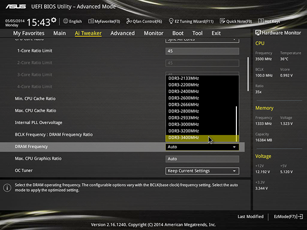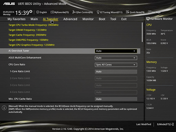 Напомним, что функциональные возможности BIOS в плане разгона процессоров отличаются для разблокированных процессоров K-серии и для обычных заблокированных процессоров, не поддающихся разгону. Мы тестировали плату Asus Z97-A с процессором Intel Core i7-4770K, то есть с разблокированным (процессора Haswell Refresh в нашем распоряжении на момент тестирования не было).