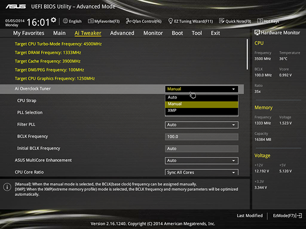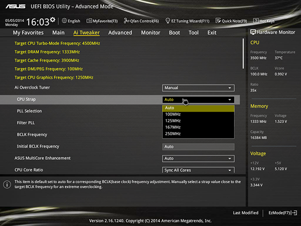 Как известно, для разблокированных процессоров Haswell имеется возможность задавать частотный множитель для частоты BCLK (1.00, 1.25, 1.66 и 2.50). То есть опорная частота для ядер процессора получается умножением частотного множителя на частоту BCLK, а частота для элементов Uncore Logic (контроллеры PEG и DMI и т. д.), чувствительных к повышению опорной частоты, остается равной частоте BCLK. На платах Asus и, в частности, на плате Asus Z97-A, все реализовано немного по другому и данный аспект необходимо учитывать при разгоне процессора.