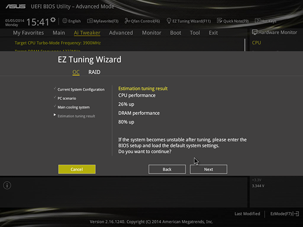 Есть здесь и еще одна интересная возможность. Речь идет о разгоне процессора и памяти с использованием встроенной утилиты EZ Tuning Wizard. Это своего рода быстрый разгон. К примеру, процессор Intel Core i7-4770K мы разогнали с использованием данной утилиты до частоты 4,4 ГГц. Не слишком выдающийся результат, но, тем не менее, для неискушенных пользователей такой способ вполне подойдет.