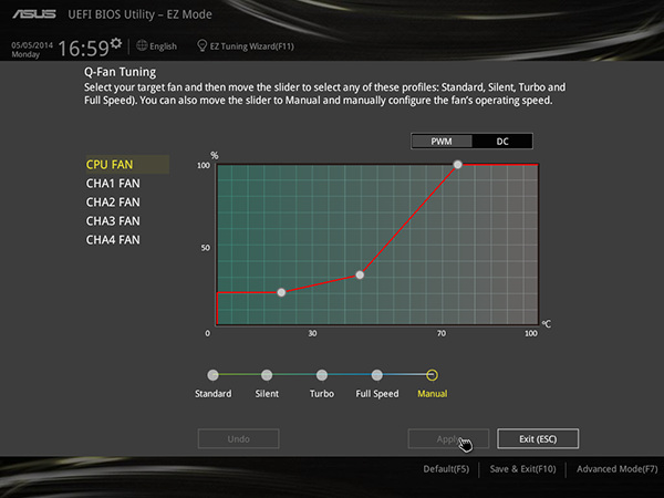 Еще одной интересной особенностью BIOS платы Asus Z97-A является возможность настройки скоростных режимов всех вентиляторов, подключенных к плате. Кроме выбора одного из трех предустановленных скоростных режимов (Standard, Silent, Turbo и Full Speed), можно настроить скоростной режим вручную. При ручной настройке скорости вращения вентилятора на процессоре имеется возможность задать график изменения скорости вращения вентиляторов от температуры процессора по трем точкам. Для каждой точки на графике задаются координаты (температура, скорость вращения). Причем скорость вращения вентилятора меняется в диапазоне от 20 до 100% для вентилятора кулера процессора и от 60 до 100% для дополнительных корпусных вентиляторов. Допустимый интервал изменения температуры составляет от 20 до 75 °C для вентилятора кулера процессора и от 40 до 75 °C — для дополнительных корпусных вентиляторов.