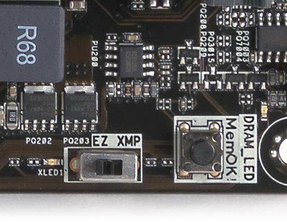 Имеется и традиционная для плат Asus кнопка MemOK для запуска системы в случае установки «необычных» модулей памяти. Кроме того, добавился и новый переключатель EZ XMP. Этот переключатель позволяет загружать XMP-профили памяти, и если ранее это делалось только через UEFI BIOS, то теперь — еще и с использованием данного переключателя.