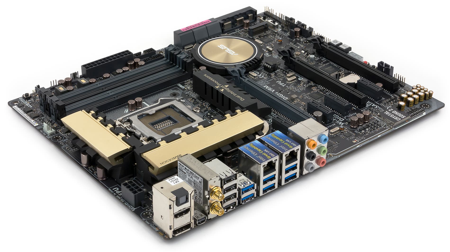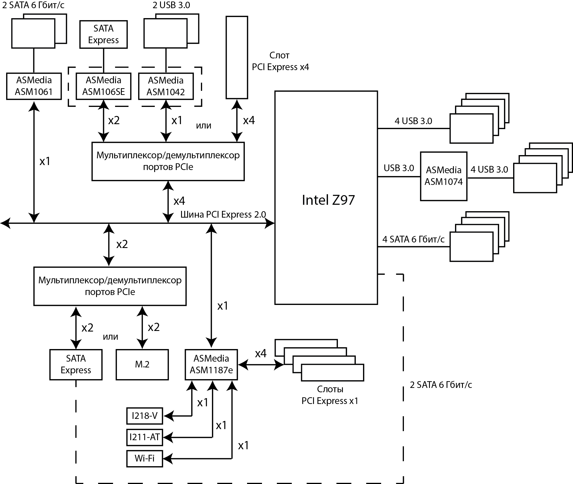 Если посчитать количество контроллеров, разъемов и слотов, использующих порты PCI Express 2.0 чипсета Intel Z97, то получится следующая картина. На слот PCI Express 2.0 x4 и четыре слота PCI Express 2.0 x1 требуется в совокупности восемь портов PCI Express 2.0. Еще три порта PCI Express 2.0 задействуют три сетевых контроллера (Intel I218-V, Intel I211-AT и беспроводной контроллер Asus Wi-Fi GO! ). Кроме того, один USB 3.0 контроллер ASMedia ASM1042 и дополнительный SATA-контроллер ASMedia ASM1061 — это еще два порта PCI Express 2.0. Далее, под разъемы M.2 и два разъема SATA Express требуется в совокупности еще шесть портов PCI Express 2.0. В результате получаем, что всего требуется 19 портов PCI Express 2.0. Но в чипсете Intel Z97 общее количество портов PCI Express 2.0 не может превышать восьми (от шести до восьми портов PCI Express 2.0 с учетом технологии Flexible IO).