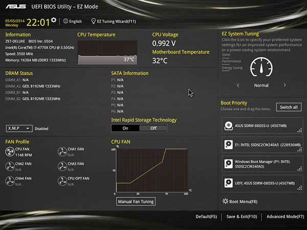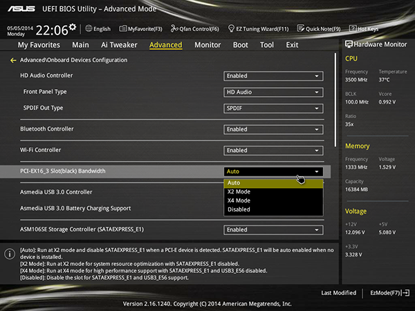 Если говорить об UEFI BIOS, то на плате Asus Z97-Deluxe он по своему интерфейсу и возможностям точно такой же, как и на плате Asus Z97-A, о которой мы уже писали. Единственное отличие в данном случае — это настройка контроллеров, подключенных к плате, что вполне естественно, поскольку на плате Asus Z97-Deluxe существенно больше дополнительных контроллеров, чем на плате Asus Z97-A.
