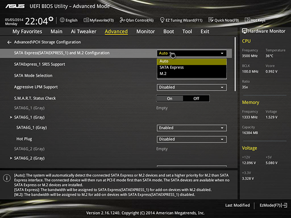 Кроме того, указывается, что разъем M.2 разделяем с разъемом SATA Express, реализованным на базе чипсета (M.2 Socket 3 shares bandwidth with SATA Express_1).