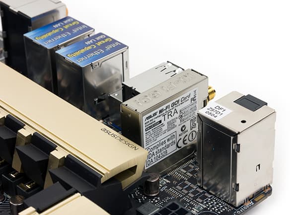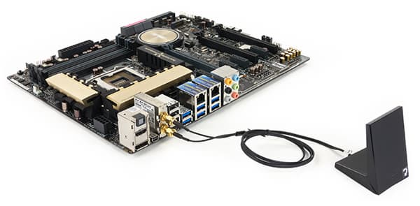 Кроме того, на плате установлен модуль беспроводной связи Asus Wi-Fi Go! В руководстве пользователя указывается, что данный модуль поддерживает стандарты 802.11a/b/g/n/ac и является двухдиапазонным (2,4 и 5 ГГц). Модуль основан на чипе Broadcom BCM4352, то есть поддерживает стандарт 802.11aс с максимальной скоростью передачи до 867 Mбит/с. В комплекте к плате прилагается и антенна, позволяющая формировать два пространственных канала связи. Также отметим, что в модуле Asus Wi-Fi Go! реализована и поддержка Bluetooth V4.0.