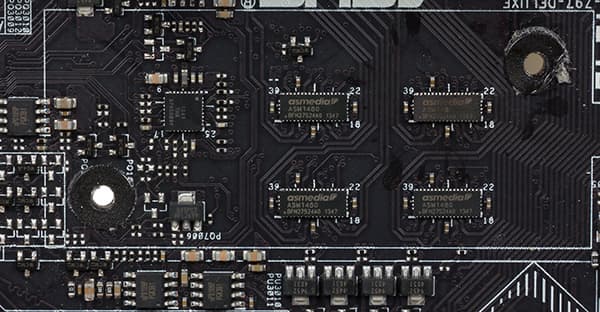 Еще два отдельных порта SATA 6 Гбит/с (разъемы этих портов промаркированы черным цветом) реализованы на базе дополнительного двухпортового контроллера ASMedia ASM1061. Наконец, еще два порта SATA 6 Гбит/с входят в состав верхнего разъема SATA Express, который реализован на базе контроллера ASMedia ASM106SE. Отметим, что в каждом разъеме SATA Express, кроме двух портов SATA 6 Гбит/с, задействуется еще и два порта PСI Express 2.0.