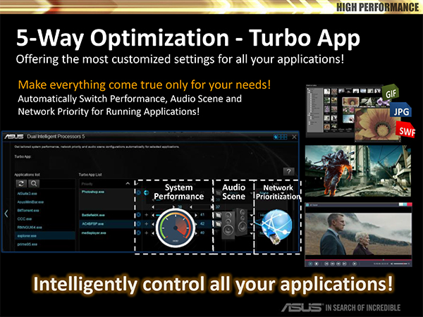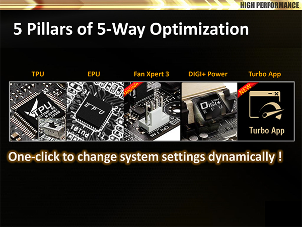 Напомним, что на платах серии Asus Z87 реализована технология 4-Way Optimization (Dual Intelligent Processors 4), теперь же используется новая версия. Составными частями технологии 4-Way Optimization являются: TPU (разгон системы), EPU (энергоэффективность), Digi+ Power (управление цифровым питанием процессора) и Fan Xpert 2 (настройка скоростного режима вентиляторов). Эти составные части позволяют оптимизировать работу системы буквально одним щелчком мыши. В новой технологии 5-Way Optimization к тем составляющим, которые уже были, добавили еще Turbo App. Кроме того, обновилась и технология Fan Xpert 2 — теперь это Fan Xpert 3.