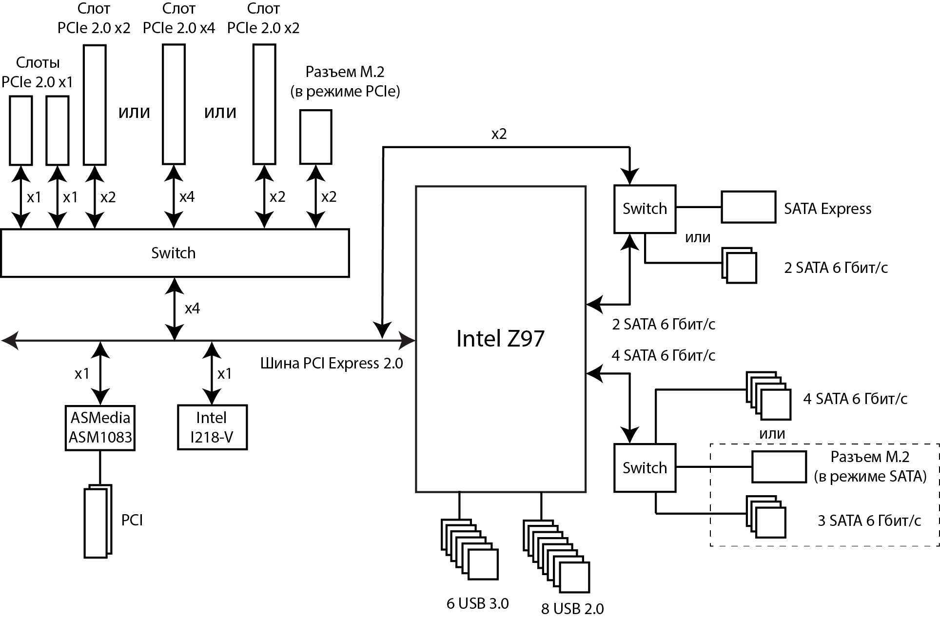 Схема подключения всех контроллеров слотов и разъемов к чипсету Intel Z97 показана на рисунке.