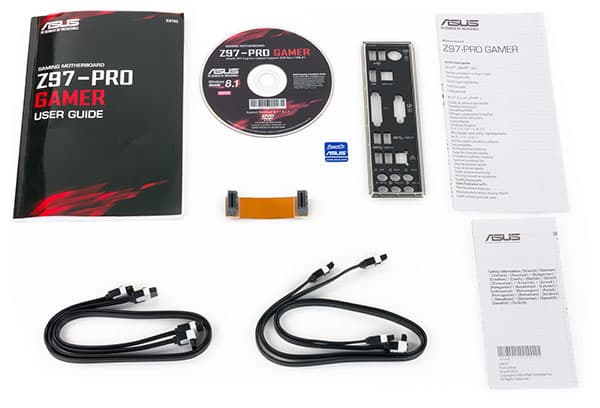 Плата Asus Z97-Pro Gamer поставляется в довольно скромной компактной картонной коробке, на которой расписаны все ее достоинства и даже приводится краткая спецификация. Комплект поставки минимальный: кроме самой платы имеется лишь инструкция пользователя, DVD-диск с программным обеспечением и драйверами, четыре SATA-кабеля (все разъемы с защелками, два кабеля имеют угловой разъем с одной стороны), мостик SLI и заглушка для задней панели платы.