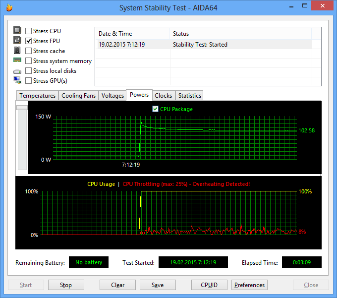 При загрузке процессора стресс-тестом Stress FPU, который в значительно большей степени нагревает процессор, наступал перегрев процессора и режим троттлинга. Частота процессора опускалась до 4,3 ГГц, а его энергопотребление составляло 102 Вт. Причем, напряжение питания ядер процессора опускалось до 1,216 В.