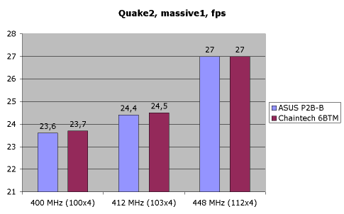 На той же тестовой системе производительность ASUS P2B-B была сравнена с производительностью победителя наших тестов Chaintech 6BTM. Результаты приведены ниже: