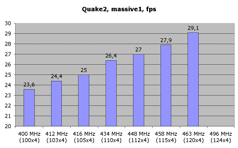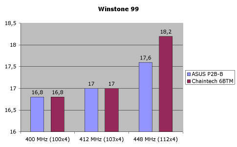 Далее, мы провели измерения производительности, показываемой системной платой ASUS P2B-B при разгоне процессора Intel Pentium II 400, который на обычной системной плате может быть разогнан до 448 МГц (112х4).