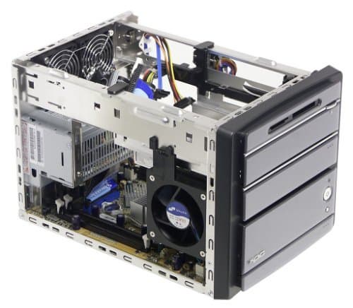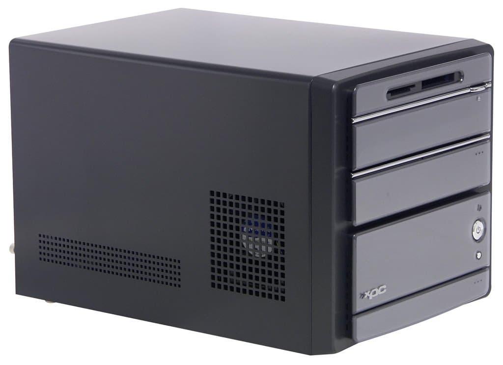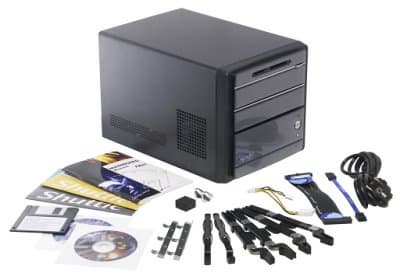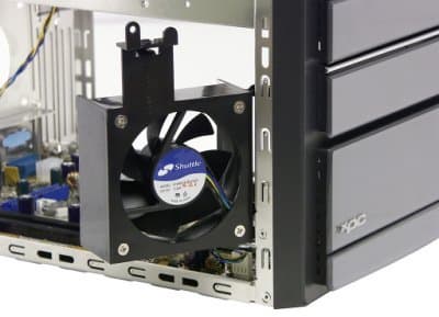 Оказывается, посадочных мест для жестких дисков хватает с избытком — их аж три (считая нижний отсек корзины)! Таким образом, выигранное от увеличения высоты корпуса место пущено на размещение винчестеров и картовода. Заметим, что инженеры Shuttle не просто «приткнули» диски в свободный угол, а предложили новую концепцию охлаждения, включающую разбиение внутреннего пространства корпуса на зоны с отдельным поступлением холодного и удалением горячего воздуха. Впрочем, если говорить именно про т. н. «зону жестких дисков», очевидно, что полностью изолированной она не является.