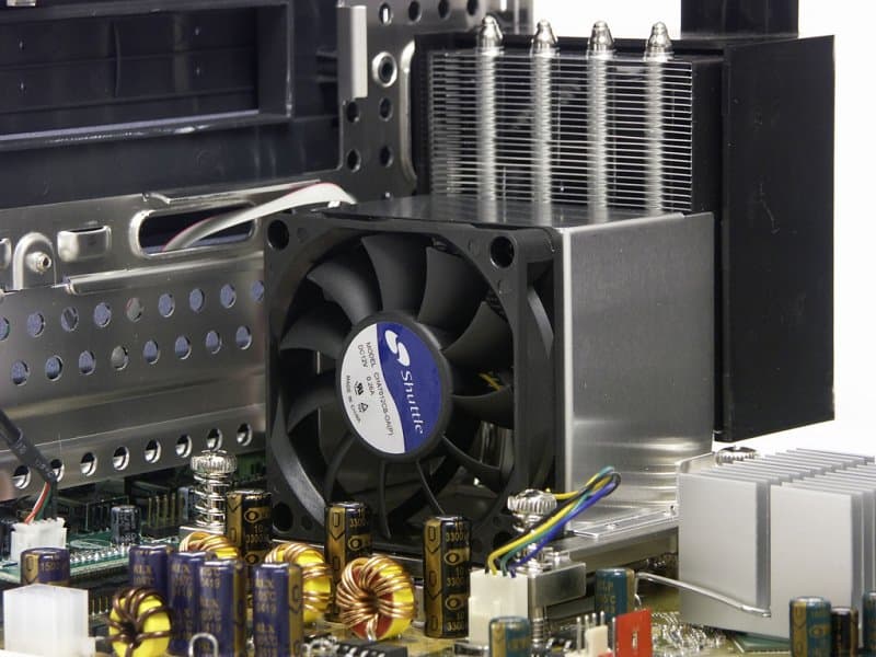 Серия корпусов «P» предполагает стратегию охлаждения, радикально отличающуюся от уже хорошо знакомой нам по серии «G». Напомним, что, не считая вентилятора в блоке питания, в корпусах Shuttle обычно присутствовал всего один кулер — процессорный и общесистемный (ICE). Причем в некоторых моделях БП охлаждался пассивно (но зато иногда вентилятор устанавливался на чипсетный радиатор). Теперь же количество вентиляторов увеличилось до умопомрачительной цифры «5» (и это не беря в расчет видеоускоритель, почти наверняка тоже охлаждаемый активно). Причем и от ICE (если понимать под ним процессорный кулер, выполненный с применением тепловых трубок) в SB95P V2 не отказались. Давайте посмотрим, как же функционирует это чудо НТП.