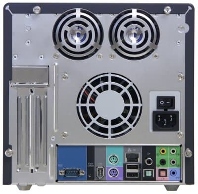 Внешний вид задней панели довольно непривычен: обилие вентиляторов и расположение двух выходов для карт расширения слева, а не справа. Однако блок разъемов с цветной маркировкой узнаваем, а наличие выключателя БП — новшество приятное; из недостатков же измененного дизайна — отсутствие посадочных мест для установки стандартных аксессуаров Shuttle, вроде параллельного порта на специальной планке. Набор интерфейсных разъемов выглядит так: PS/2-порты для клавиатуры и мыши, 1 COM, порт FireWire, 2 разъема USB (2.0), сетевая розетка (Gigabit Ethernet) и 5 аудиоразъемов для аналогового вывода 8-канального звука. Наличие оптического входа и выхода S/PDIF, а также коаксиального выхода S/PDIF дает возможность передачи звука «по цифре». Вновь мы рассматриваем топовую модель barebone-комплекта, и вновь у нее отсутствует выход на монитор, так как лежащий в основе топовый чипсет — дискретный. Зато, как и у последнего из рассмотренных миникомпьютеров, Shuttle SB77G5, имеется кнопка сброса CMOS.