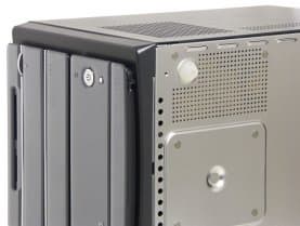 Корпус серии «P» по габаритам чуть больше различных модификаций «G»: его размеры составляют 220x325x210 мм, то есть на 20—25 мм превышают таковые для «G» по каждому измерению. Крышка алюминиевого корпуса выкрашена в черный цвет (хотя в других моделях цвет, разумеется, может быть иным), накладка на переднюю панель — традиционно пластиковая. В устройстве передней панели удачно (на наш взгляд) комбинируются черты G4 — прозрачная пластиковая накладка с серым фоном, и G5 — наличие крышек на отсеках для дисковых накопителей и интерфейсных разъемов. Barebone-комплект выглядит строго и красиво (шарма добавляют металлические полоски между отсеками и кнопки включения и перезагрузки системы), а по удобству в использовании, как мы уже отмечали, вариант с крышками наиболее предпочтителен.