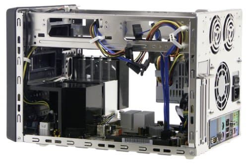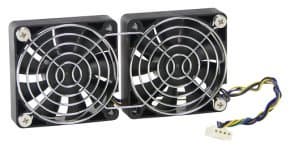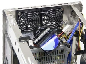 Часть охлаждения внутренностей корпуса берет на себя пара 60-миллиметровых вентиляторов, устанавливающихся «под потолок» на задней панели. Поскольку ниже расположен «открытый всем ветрам» БП со своим мощным вентилятором, можно предположить, что первейшая обязанность этой задней пары — охлаждение «зоны жестких дисков». Ну а как оно получается на самом деле, мы сейчас и посмотрим.