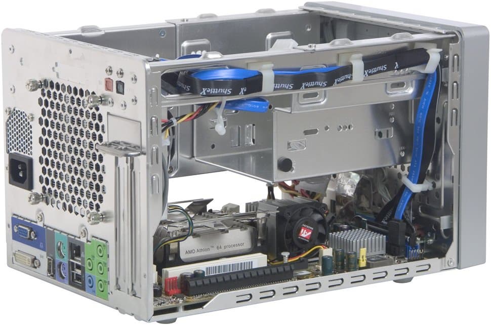 В основе ST20G5 лежит материнская плата Shuttle FT20 на чипсете ATI Xpress 200, но не со стандартным южным мостом ATI, а с совместимым по подключению ULi M1573. В принципе, у этого моста есть ряд преимуществ перед ATI IXP400, но на этой плате из них реализована только поддержка звука High Definition Audio. Минусом является необходимость использовать дискету с драйверами (и, соответственно, подключать дисковод) для установки Windows 2000/XP/2003 — контроллер дисков ULi M1573 неработоспособен со стандартными драйверами Microsoft. Функциональность материнской платы комплекта, обусловленная возможностями примененной чипсетной связки, выглядит так: поддержка процессоров AMD Sempron и Athlon 64/FX/X2 (Socket 939), до 2 ГБ памяти DDR266/333/400 (на плате всего 2 слота DIMM) с возможностью работы в двухканальном режиме, интегрированная графика ATI Radeon Xpress 200 (аналог ATI Radeon X300), порт PCIEx16 для внешних видеоускорителей, 2 порта SATA с функцией RAID 0 и 1, 1 канал UATA133 для 2 устройств, 8 портов USB 2.0 и 8-канальный звук HDA (использован соответствующий кодек Realtek ALC880). К тому же на плате распаяны контроллер VIA VT6307, благодаря которому осуществляется функционирование 2 портов FireWire, и сетевой адаптер Broadcom 5751 (10/100/1000 Мбит/с PCI-E Gigabit Ethernet).
