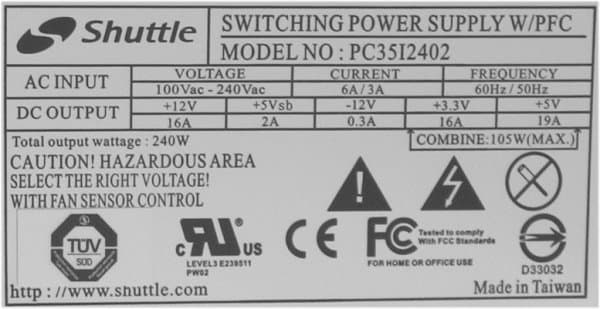 Silent X — серия БП Shuttle с повышенной мощностью и улучшенной системой охлаждения при очень невысоком уровне производимого шума. В данной модели применен БП мощностью 240 Вт, что далеко не рекорд, но мы в нашем тестировании ни с какими проблемами не столкнулись, хотя имитировали максимально возможную загрузку системы (3D-игры + копирование информации с DVD-привода). Silent X PC35I2402 имеет один разъем питания SATA, а вот 6-контактного разъема питания для PCIE-видеокарт он лишен, вместо этого предлагается подпитывать шину PCI Express через дополнительный разъем (как для флоппи-дисковода) на плате. БП имеет относительно большой, 80-миллиметровый вентилятор посередине внутренней боковой стороны — вариант, визуально представляющийся не самым удачным. Частота вращения этого вентилятора автоматически регулируется в зависимости от температуры внутри блока питания.