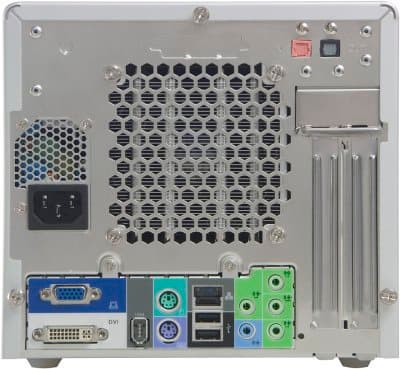 Задняя панель выглядит так же, как и у большинства современных barebone-комплектов, разве что аналоговый VGA-выход не только присутствует, но и дополнен к тому же цифровым DVI-выходом на монитор. Набор стандартных интерфейсных разъемов выглядит так: PS/2-порты для клавиатуры и мыши, порт FireWire, 2 разъема USB (2.0), сетевая розетка (Gigabit Ethernet) и 5 аналоговых аудиоразъемов для вывода 8-канального звука. Есть возможность получать и передавать звук «в цифре», для чего в наличии оптический вход и выход S/PDIF. Материнская плата комплекта позволяет реализовать еще 4 порта USB (есть возможность дополнительно приобрести соответствующую планку для вывода портов на заднюю панель) и устанавливать две карты расширения. COM-портов нет, параллельный порт может быть выведен на покупаемую отдельно планку. Между аудиоразъемами и местом вывода карт расширения в задней стенке корпуса есть маленькая дырочка — это уже знакомое нашим читателям отверстие для доступа к кнопке сброса CMOS (пользоваться очень удобно).