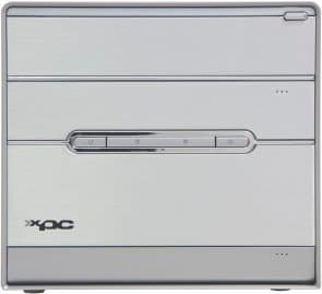 Во внешнем виде передней панели применение корпуса G5 означает наличие откидывающихся крышек на отсеках для дисковых накопителей и интерфейсных разъемов. Крышка 5-дюймового отсека традиционно для таких решений подпружинена, так что распахивается при выдвижении лотка CD/DVD-привода и автоматически закрывается после загрузки диска. Корпус (как и всегда) алюминиевый, у этой модели он покрыт серой краской, а пластиковая накладка на переднюю панель для основной части поверхности использует слегка недошлифованные алюминиевые пластины — смотрится отлично! Размер корпуса стандартный (для Shuttle XPC) — 200x300x185 мм (ШxГxВ).