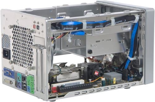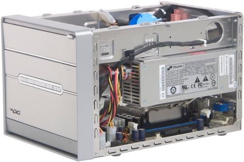 Замечательной особенностью внутреннего дизайна G5 является полное отсутствие путаницы проводов и кабелей, характерной для предыдущих поколений корпусов Shuttle. Интерфейсные разъемы для передней панели продуманно разводятся у переднего края платы, а выходы для подключения кабелей S/PDIF и звуковые входы, как и разъем для процессорного вентилятора, — у задней. Более того, barebone-комплект продается с уже предустановленными шлейфами для дисковых накопителей, а «хвосты» разъемов питания от БП продуманно разделены, проложены по стойкам корпуса (к предполагаемому месту использования) и закреплены стяжками. Повторимся, внутренний дизайн G5, на наш взгляд, очень удачен и вполне подстать внешнему виду корпуса.