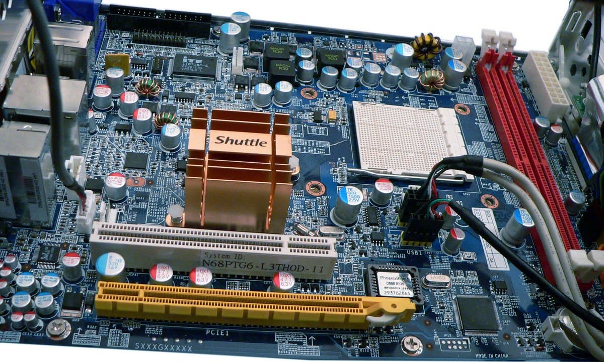 На плате установлен 3-канальный стабилизатор напряжения питания процессора, используется по 3 полевых транзистора на канал, 10 конденсаторов емкостью 820 мкФ и 3 по 330 мкФ, все конденсаторы на плате фирменные твердотельные. Перемычек на плате нет, для сброса CMOS необходимо нажать на кнопку на задней панели, что неоднократно встречалось нам в продукции Shuttle и, действительно, очень удобно.
