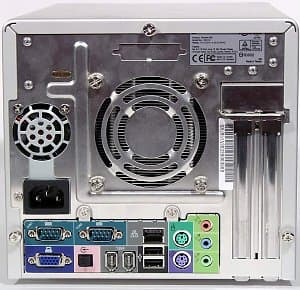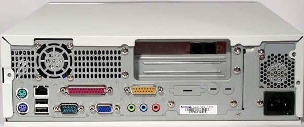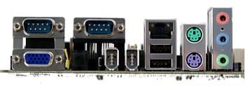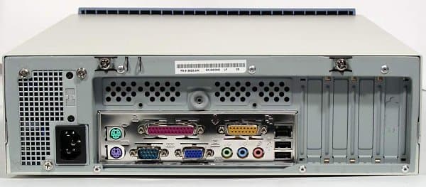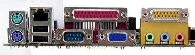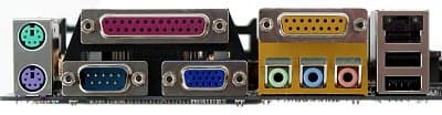 - Разъемы на задней панели: PS/2 Mouse & Keyboard, 1xCOM, 1xLPT, 1xVGA, 1xJoystick, 3xAudio (In/Out/Speakers), 1xEthernet, 2xUSB (1.1)