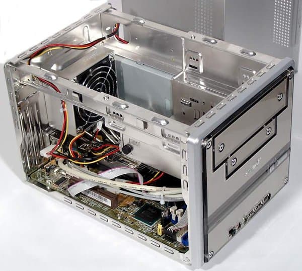 К тому же и корпус спроектирован хуже: блок накопителей даже не поворачивается, только снимается целиком, а винчестер вообще зажат в крайне неудобном для доступа (в т. ч., подключения кабелей) и охлаждения положении. А вот приятно радует отличительное свойство именно этого barebone — он очень тихий, благодаря системе охлаждения CPU — мы даже специально приводим фото этого интересного кулера.
