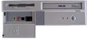 Классический вариант «slim desktop», правда, за счет малой ширины корпуса и выступающей накладки из серо-голубого пластика внешне смотрящийся «не очень-то и slim». Накладка немного грубовата по исполнению — к примеру, на CD-ROM остается неприкрытой не только выдвижная каретка, но и часть лицевой панели привода, что смотрится не очень аккуратно (тем более что он стандартного «офисно-бежевого» цвета). Мы бы, как говорится, «не выступали», но посмотрите на фото ASUS Prodigy — и все станет понятно. Вообще, может, это и субъективно, но накладка как-то выбивается из общего вида корпуса, оставляя легкое впечатление «чужеродности». Хорошо, что она, по крайней мере, снимается, правда, передняя панель, которая будет находиться в поле вашего зрения долгие часы, после этого выглядит не самым впечатляющим образом. Также отметим, что перестановка ножек позволяет устанавливать корпус набок.