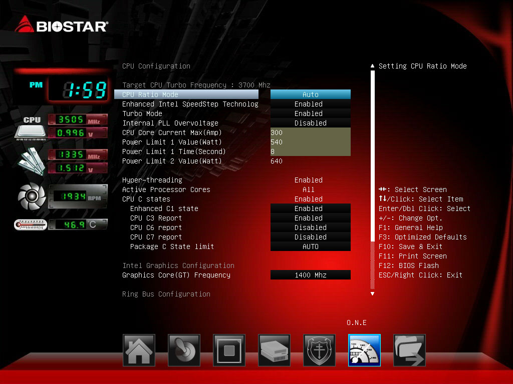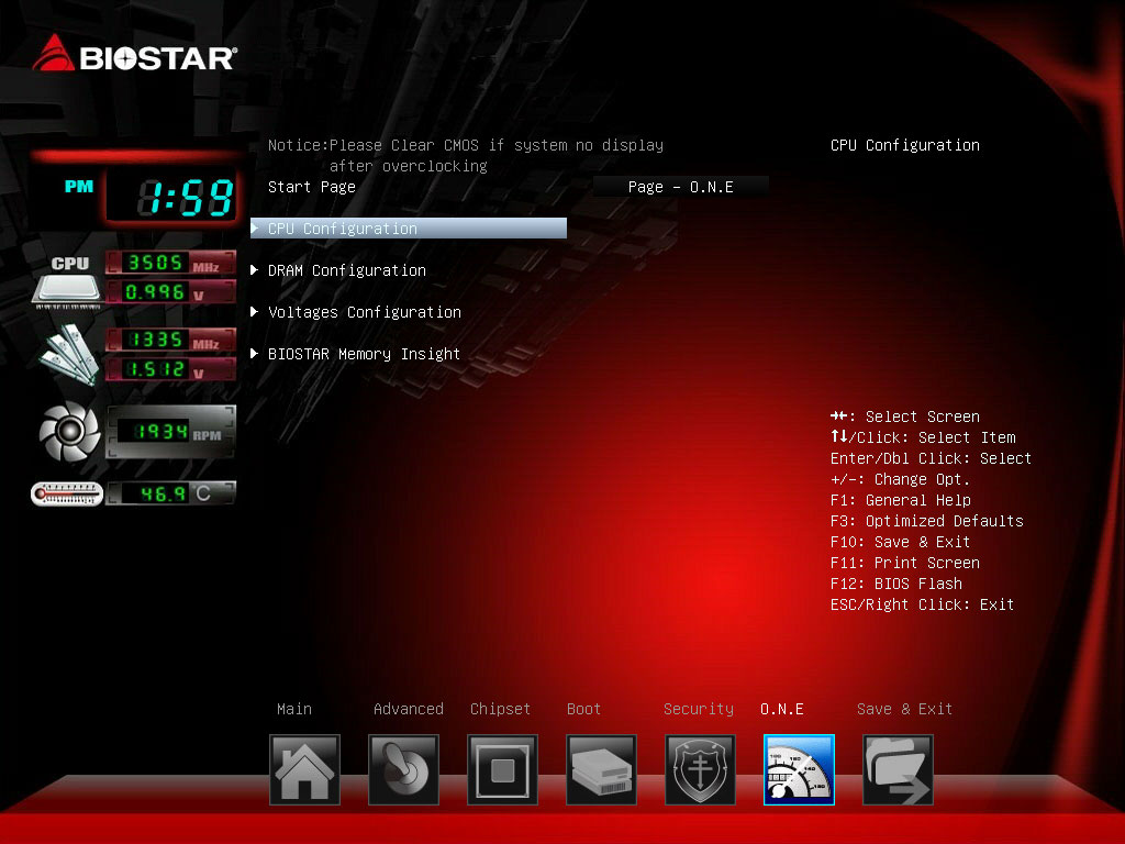 Для разгона процессора и памяти предназначена вкладка O.N.E., в которой доступны еще четыре вкладки: CPU Configuration, DRAM Configuration, Voltage Configuration и Biostar Memory Insight. Изменение частоты работы процессора и настройка режим Turbo Boost производится на вкладке CPU Configuration.