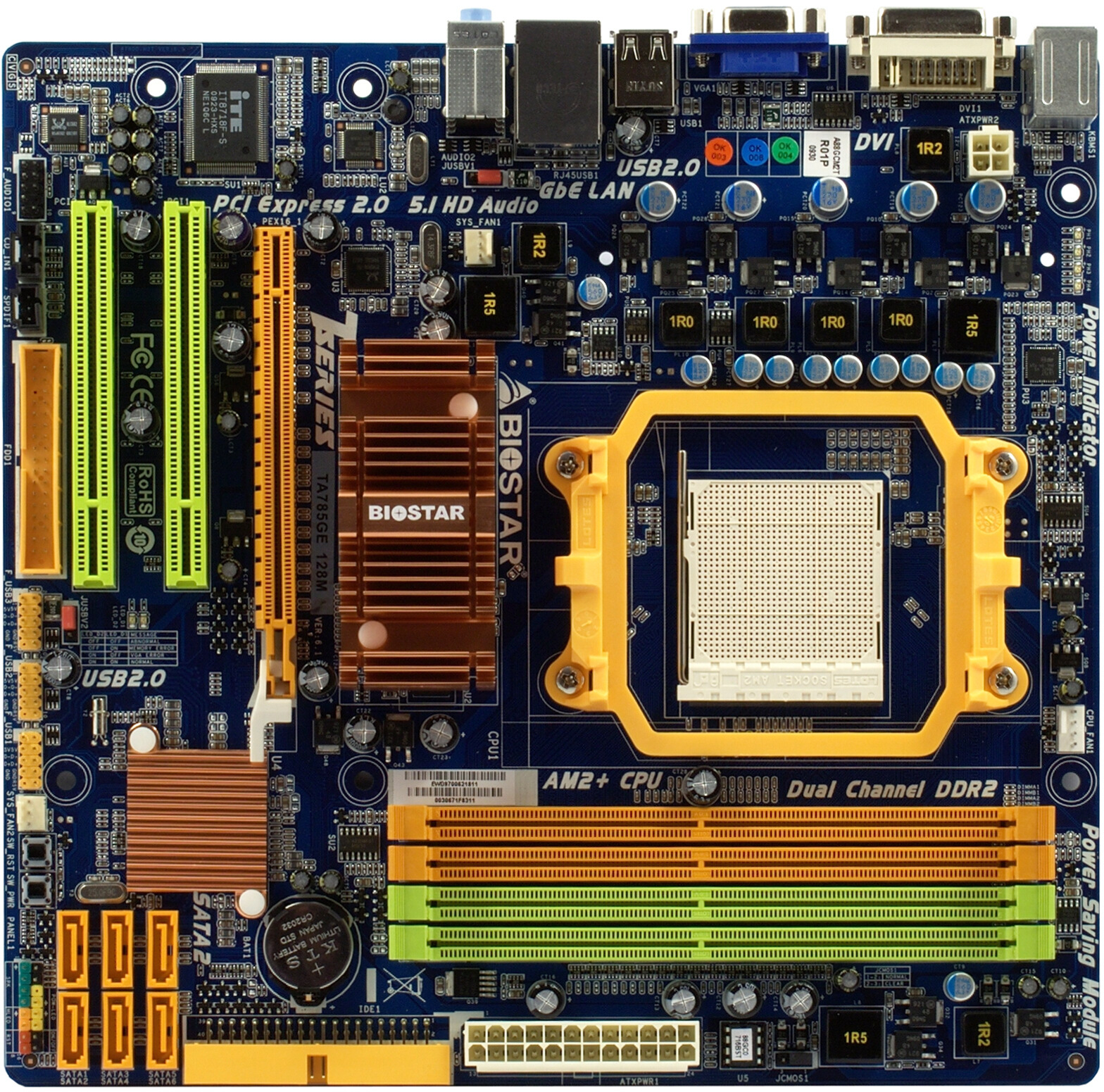 Плата основана на чипсете AMD 785G (северный мост AMD 785G и южный SB710), о возможностях которого вы можете узнать из обзорной статьи по ссылке. Поддерживаются все процессоры с разъемом Socket AM2+/AM3, возможна установка до 16 ГБ DDR2-667/800/1066. Для подключения накопителей установлено 6 внутренних портов SATA/300, диски могут объединяться в режимах RAID 0, 1 и 0+1. Также, как и на всех платах на современных чипсетах под AMD-платформу, имеется чипсетный канал IDE с поддержкой 2 накопителей PATA/133.