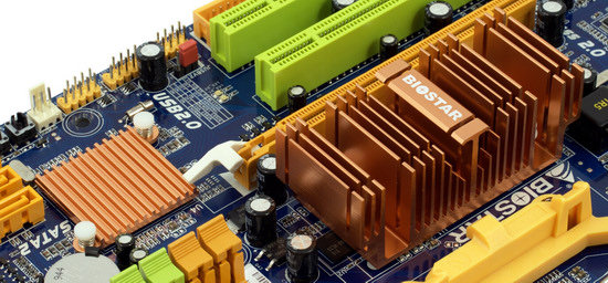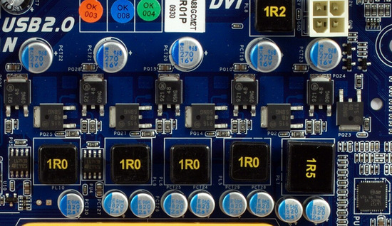 В пятиканальном стабилизаторе напряжения установлено по 2 полевых транзистора на канал, 9 твердотельных конденсаторов по 820 мкФ и 5 — по 270 мкФ. Схема вполне достаточная для питания процессоров с TDP до 125 Вт, включая и новую версию Phenom II X4 965 (ревизия C3), о чем сообщается в списке совместимых процессоров для этой платы на сайте Biostar. Тем не менее, учитывая отсутствие радиаторов на полевых транзисторах, очевидно, что плата может работать с такими процессорами преимущественно в штатном режиме, а на установку рекордов в разгоне уж точно не рассчитана.