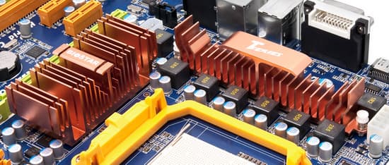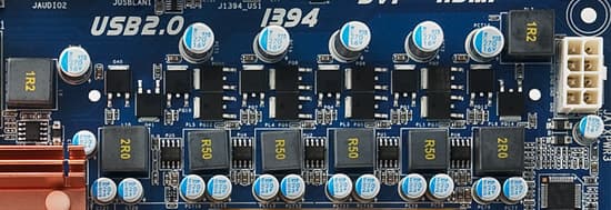 Стабилизатор напряжения питания процессора 5-канальный, в четырех каналах, питающих процессорные ядра, применены по 3 полевых транзистора, в фазе, отвечающей за питание встроенного северного моста процессора, установлены 2 полевых транзистора. В схеме установлены 10 конденсаторов — по 820 мкФ и 5 — по 270 мкФ, все конденсаторы на плате — твердотельные, японского производства. Разумеется, нет никаких сомнений, что такой стабилизатор обеспечит питание процессоров с TDP до 140 Вт включительно.