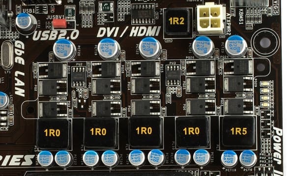 По меркам компактной платы: 5 каналов по 3 полевых транзистора в каждом, это очень хорошее оснащение процессорного стабилизатора напряжения. В схеме установлены 10 конденсаторов по 820 мкФ и 5 — по 270 мкФ, все конденсаторы на плате твердотельные. Схема позволяет обеспечить поддержку процессоров с TDP до 140 Вт включительно.