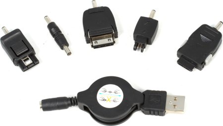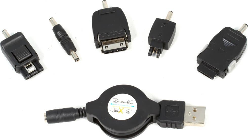- USB-зарядник для старых моделей мобильных телефонов (вроде Siemens 45-й серии) с вытягиваемым из катушки проводом (длиной ~1 м), который регулярно перестает втягиваться обратно; идея неплохая, и актуальная именно для старых телефонов, в комплекте которых отсутствовал USB-кабель, но реализация с огрехами — разъемы собраны не очень качественно, возможно даже повреждение приемного разъема на телефоне;