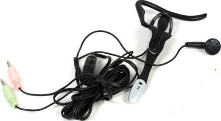 - Проводная гарнитура (длина провода ~2 м) с регулятором громкости (колесиком): один из динамиков просто вставляется в ухо («капелька»), второй, совмещенный с микрофоном на толстой, но хорошо гнущейся и фиксируемой в почти любом положении ножке, имеет специальную конструкцию для крепления — эта система обеспечивает среднюю усталость уха и конечно не дотягивает по удобству до крепления наушников «серьезных» производителей (вроде Koss); качество звука — нормальное, годящееся для интернет-телефонии или общения в сетевых играх, но, разумеется, не для прослушивания музыки (разве что для самых убежденных сторонников MP3 128 Кбит/с);