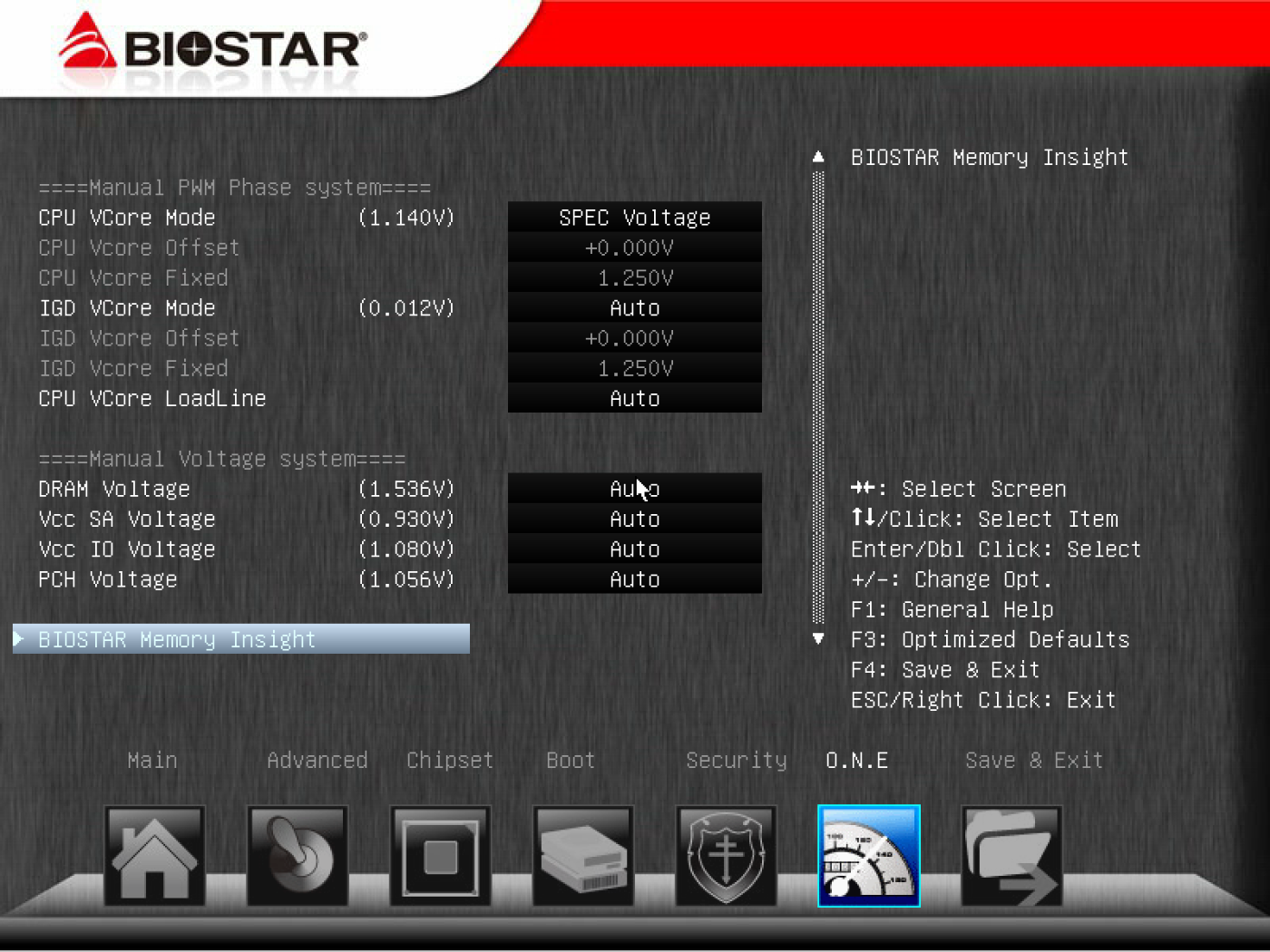 За установку режимов работы процессора и оперативной памяти у Biostar отвечает выделенный раздел «O.N.E.». Данная плата не относится к серии TPower, но о позиционировании для разгона говорят надписи на коробке, которые, правда, больше нигде в характеристиках не встречаются. Пользователю доступны изменения множителей процессора, базовой частоты, пределов токов и мощностей, напряжений отдельных блоков процессора (в режиме смещения или абсолютных значений). Для настройки памяти есть большое количество таймингов, множитель частоты и напряжение. Предусмотрен встроенный декодер SPD, но есть сомнение в правильности его работы с XMP. Отметим, что при неудачном разгоне система перезагружается со сбросом некоторых настроек раздела «O.N.E.».