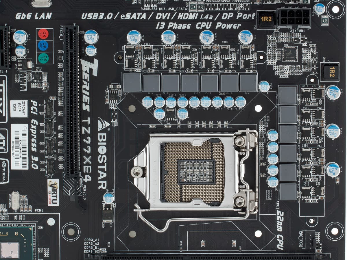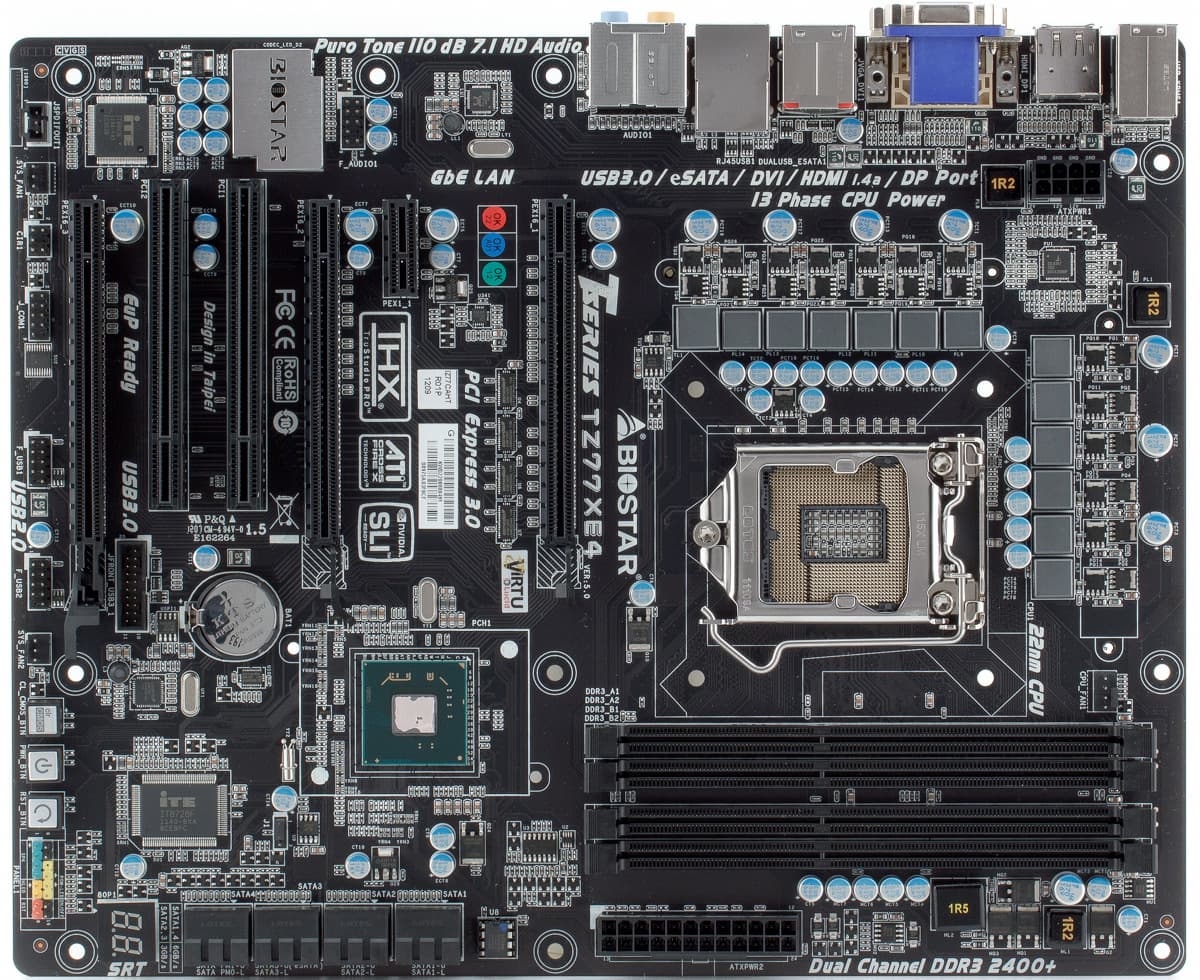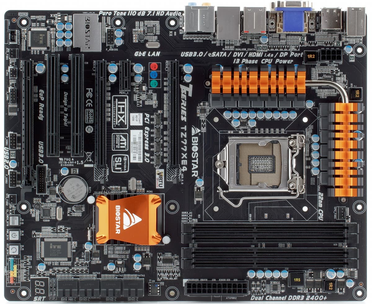 Сегодня компания Biostar имеет в своем арсенале четыре материнские платы формата ATX на чипсете Intel Z77. Наиболее мощная модификация — TZ77XE4 — будет рассмотрена в этой публикации. В отличие от нее, модель TZ77XE3 не имеет дискретного контроллера SATA 6 Гбит/с, порта eSATA и выхода DisplayPort, но на ней установлен второй слот PCIe x1 и немного изменена печатная плата. Еще более простые TZ77A и TZ77B лишены второго слота для установки видеокарт на «процессорную» шину PCIe.