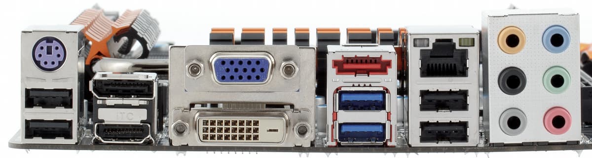 Задняя панель материнской платы выглядит вполне достойно по современным требованиям для массовых продуктов. На ней можно найти универсальный порт PS/2, четыре USB 2.0, видеовыходы встроенной в процессор графики, два USB 3.0, один eSATA (без питания), гигабитный сетевой порт с индикаторами состояния и блок из шести стереоджеков звукового контроллера.