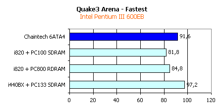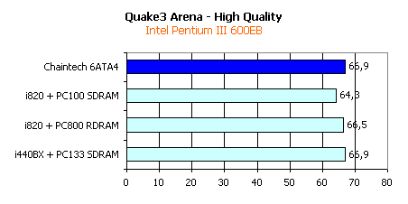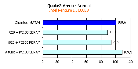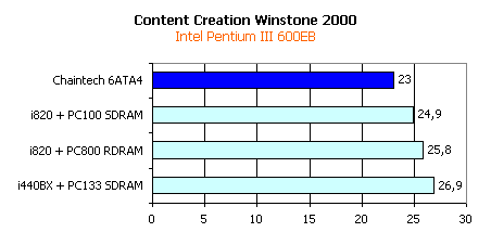 На фоне своего основного конкурента, системы на i820+SDRAM, Chaintech 6ATA4 на VIA Apollo Pro133A смотрится весьма и весьма неплохо. Хотя она и отстала от Supermicro P3SCD в офисных приложениях, в играх Chaintech 6ATA4 просто вне конкуренции.