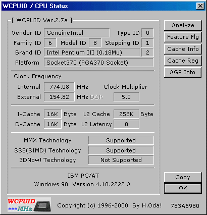 Теперь посмотрим, что же на практике. Для проверки оверклокинговых возможностей Chaintech 6ATA4 мной была предпринята попытка разгона процессора Intel Pentium III 500E. В системе использовалась PC133 SDRAM и видеокарта на базе NVIDIA GeForce256. При разгоне данного экземпляра процессора на системе с материнской платой на чипсете i440BX, системную шину удалось разогнать только до 133 МГц, при этом процессор работал на 667 МГц соответственно. При дальнейших попытках увеличить частоты FSB система переставала функционировать из-за чрезмерного разгона шины AGP, при котором используемая видеокарта не могла работать корректно. Что же, данная проблема с i440BX, позволяющего использовать только множители 1 и 2/3 для получения частоты AGP из чаcтоты FSB хорошо известна. Платы на чипсете VIA Apollo Pro133A, в том числе и 6ATA4, используют же при частоте FSB 133 МГц для получения частоты AGP множитель 1/2, гарантируя корректное функционирование этой шины. Результат не заставил себя ждать — процессор удалось разогнать до 155 МГц по шине, то есть до 775 МГц: