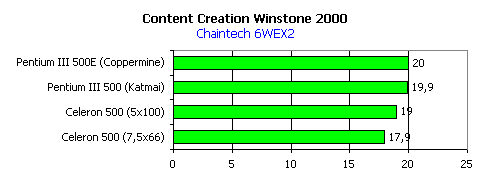При работе с различными типами процессоров, как Slot 1, так и Socket370, системная плата Chaintech 6WEX2 продемонстрировала блестящую стабильность в работе, что, в общем-то, является характерной чертой практически всех плат от Chaintech.